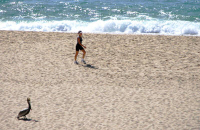 the beach accompanied by a Brown Pelican |