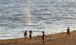 on the beach with a cruise ship in the distance |