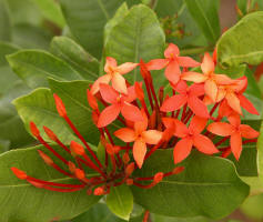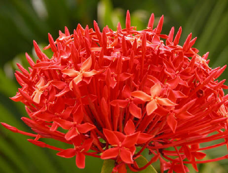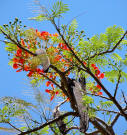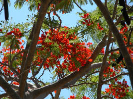 Flamboyant, or Flame Tree, with bright red flowers and long seed pods |