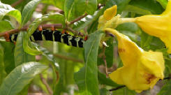 Frangipani Caterpillar, about four inches long, eating a Yellow Allamanda |