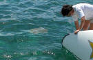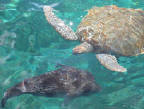 The Green Sea Turtle and the Blowfish arrive for some lunch scraps |