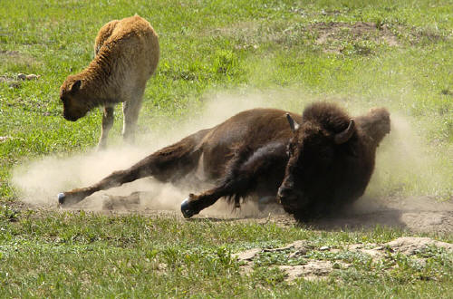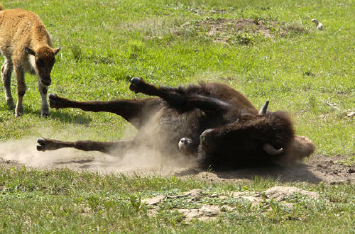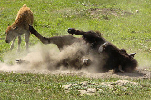 and a bison wallows while